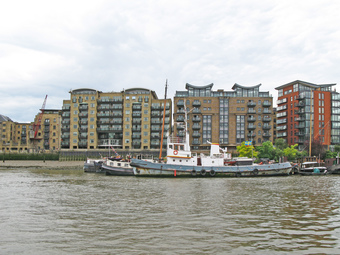 Das Foto gehört zur Serie London 2016. Es zeigt von rechts Providence Tower und Springalls Wharf Apartments (Bermondsey Wall W, London). Es gelten die Nutzungsbedingungen der Mediothek und Pixiothek.