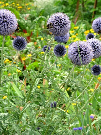 Das Foto gehört zur Serie Blumen im Garten. Es zeigt die Blüte einer Kugeldistel (Echinops ritro). Die Kugeldistel ist eine mehrjährige und anspruchslose Staude. Sie findet man in sonnigen Lagen und sie ist eine Bienenpflanze. Hier suchen Erdhummeln nach Nektar. Es gelten die Nutzungsbedingungen der Mediothek und Pixiothek.