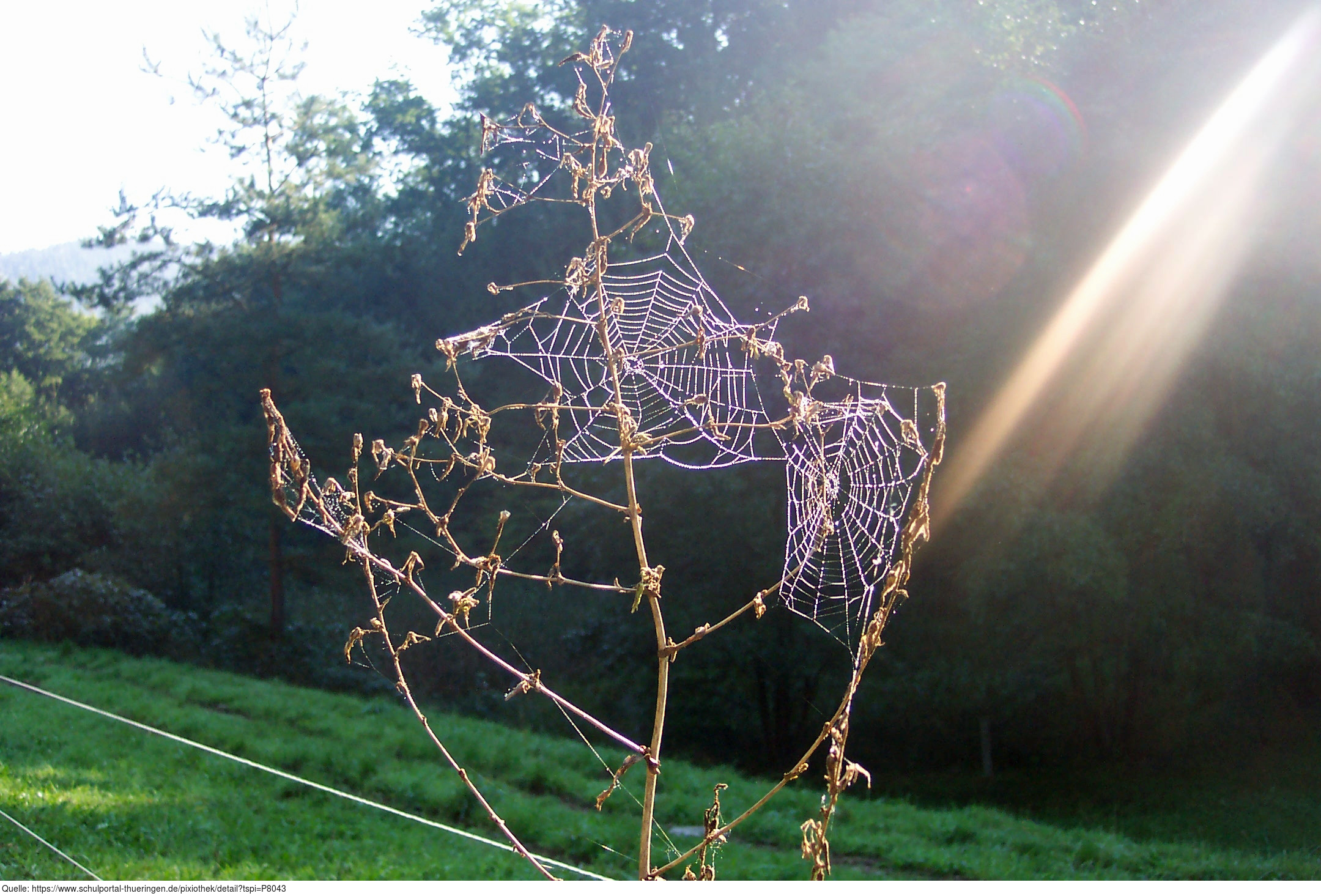 Das Bild gehört zur Serie "Sommerspaziergang". Es zeigt ein Spinnennetz mit Tautropfen. Es gelten die Nutzungsbedingungen der Mediothek und Pixiothek.
