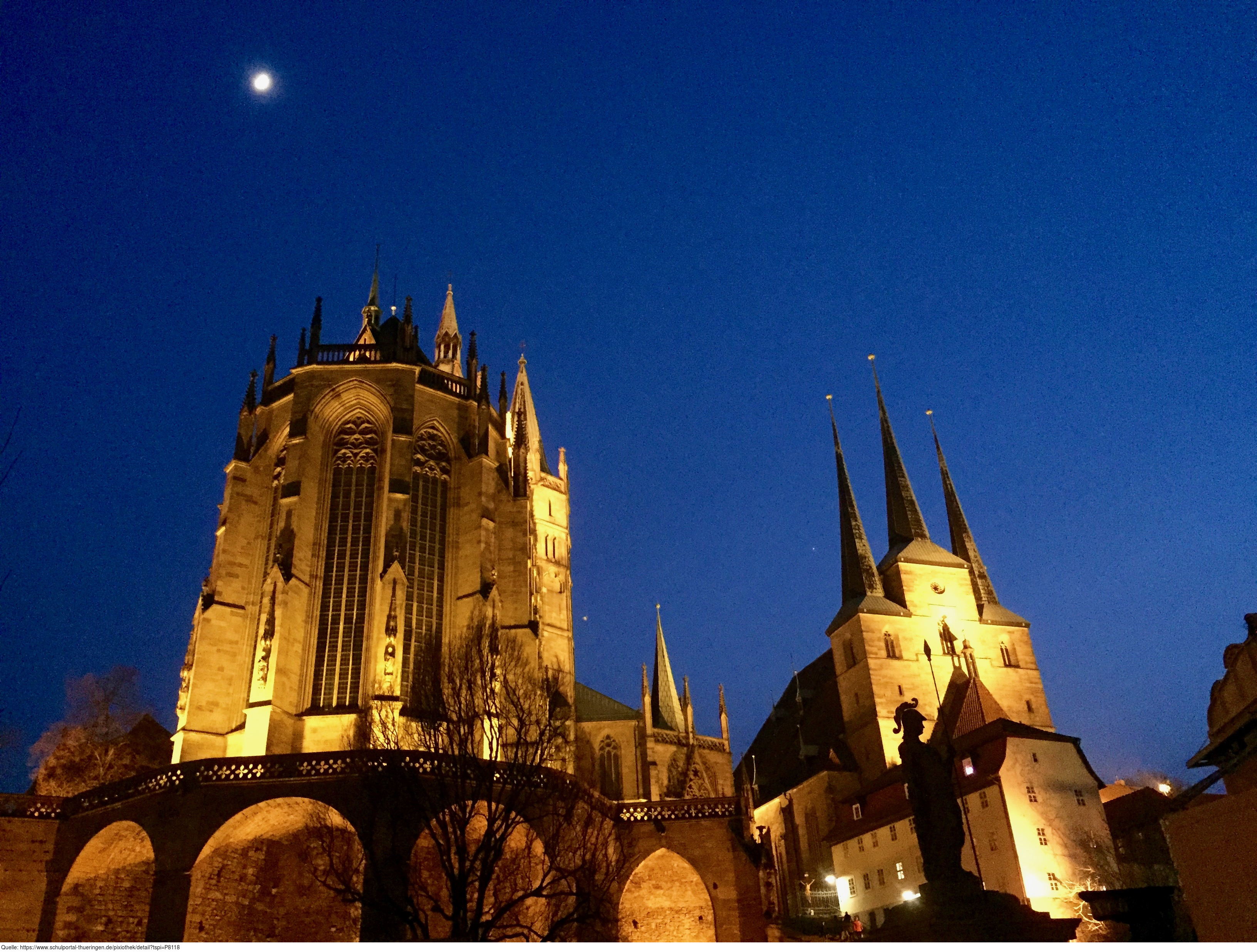 Abgebildet ist der beleuchtete Erfurter Dom bei Nacht, aufgenommen zum Weihnachtsmarkt 2018. Es gelten die Nutzungsbedingungen der Mediothek und Pixiothek.