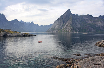 Das Foto gehört zur Serie "Lofoten". Es zeigt ein Ruderboot im Fjord. Es gelten die Nutzungsbedingungen der Mediothek und Pixiothek.