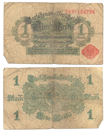 Das Foto gehört zur Serie "Währungen im Deutschen Kaiserreich 1914 bis 1918". Es zeigt einen Darlehenskassenschein über "Eine Mark" vom 05. August 1914. Es gelten die Nutzungsbedingungen der Mediothek und Pixiothek.