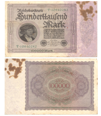 Das Foto gehört zur Serie "Zahlungsmittel in der Weimarer Republik (1918-1933)". Es zeigt eine Reichsbanknote über "Hunderttausend Mark" vom 01. Februar 1923. Es gelten die Nutzungsbedingungen der Mediothek und Pixiothek.