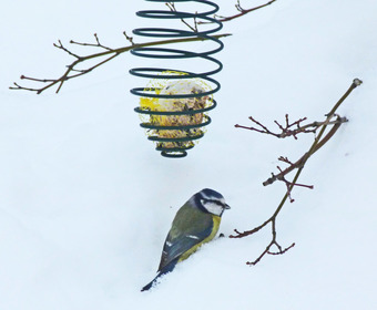 Das Foto gehört zur Serie "Vögel im Winter". Es zeigt eine Blaumeise an der Futterspirale. Es gelten die Nutzungsbedingungen der Mediothek und Pixiothek.