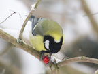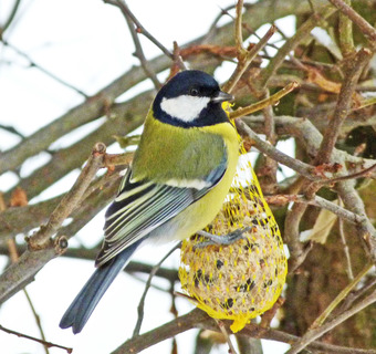 Das Foto gehört zur Serie "Vögel im Winter". Es zeigt eine Kohlmeise am Meisenknödel. Es gelten die Nutzungsbedingungen der Mediothek und Pixiothek.
