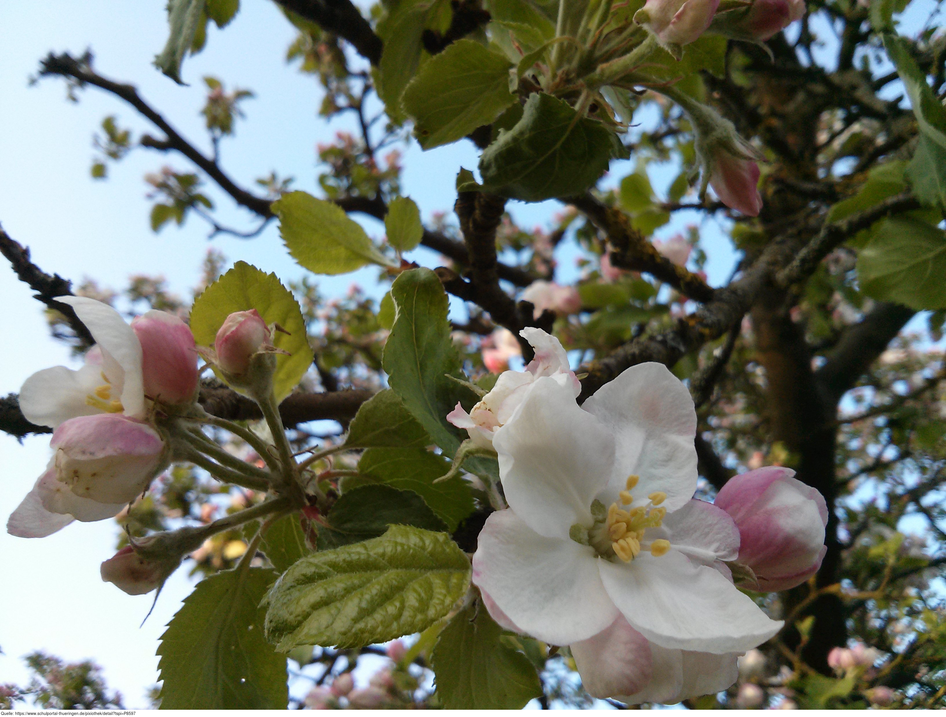 Das Foto gehört zur Serie "Obstbäume". Es zeigt Blüten an einem Apfelbaum. Das Bild ist unter CC0 lizenziert und kann somit frei verwendet werden.