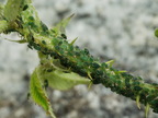 Das Foto gehört zur Serie "Schädlinge von Nutzpflanzen". Es zeigt einen Ast mit Blattläusen (Aphidoidea). Blattläuse ernähren sich von Pflanzensaft. Das Bild ist unter CC0 lizenziert und kann somit frei verwendet werden.