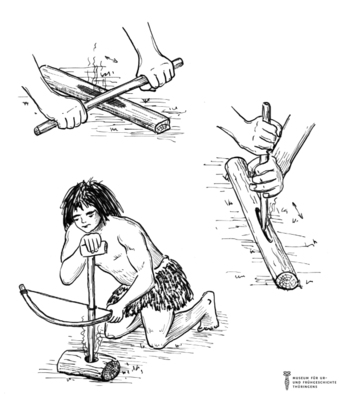 Das Bild gehört zur Serie "Zeichnungen Steinzeit - Museum für Ur- und Frühgeschichte Thüringens". Abgebildet ist eine Auswahl von Möglichkeiten, um Feuer zu machen. Es gelten die Nutzungsbedingungen der Mediothek und Pixiothek.