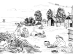 Das Bild gehört zur Serie "Zeichnungen Steinzeit - Museum für Ur- und Frühgeschichte Thüringens". Abgebildet ist ein Geröllwerkzeug als ein typisches Steinwerkzeug. Es gelten die Nutzungsbedingungen der Mediothek und Pixiothek.