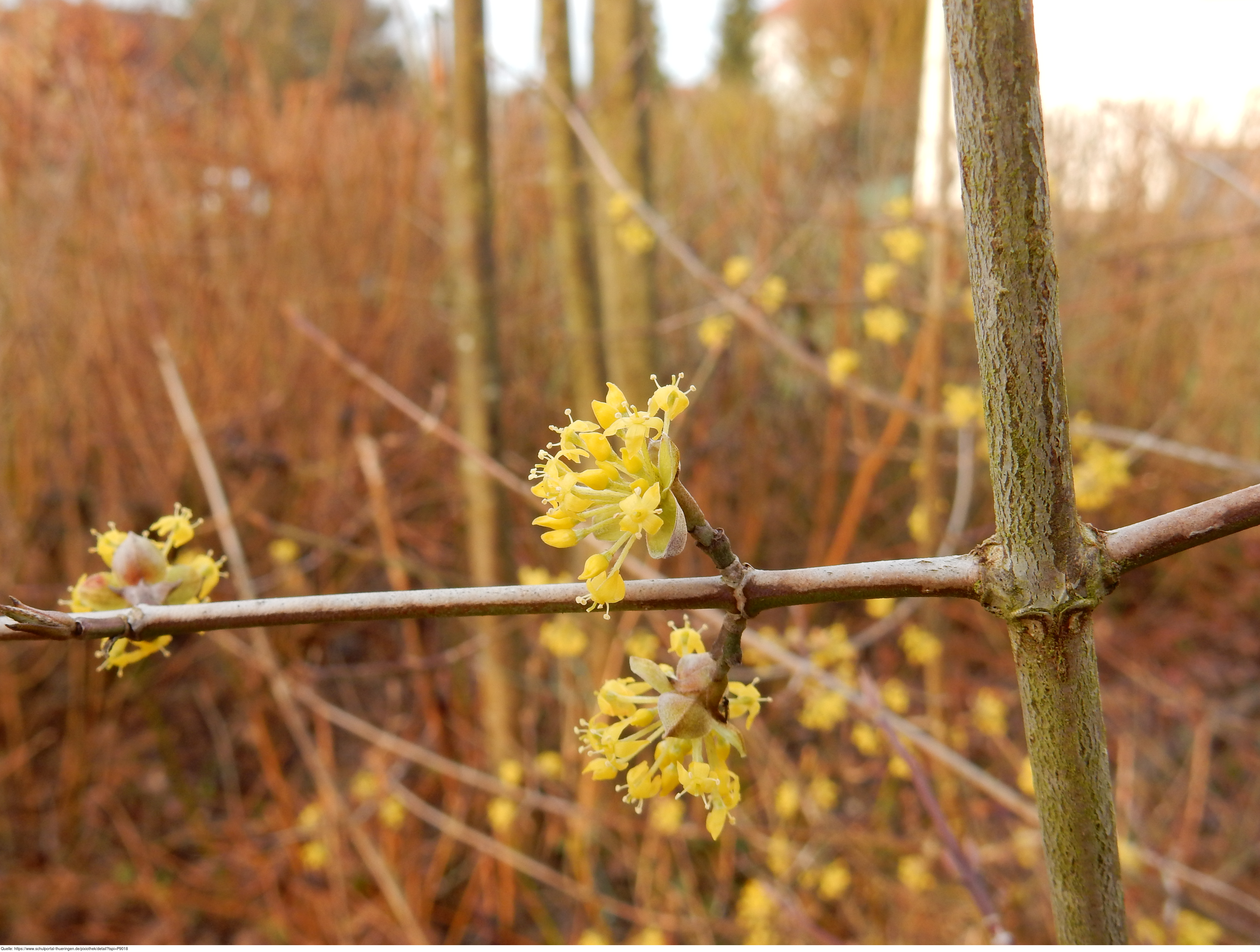 Das Foto gehört zur Serie "Laubbäume". Es zeigt eine blühende Kornelkirsche (Cornus mas), auch Herlitze, Dürlitze, Hirlnuss genannt. Das Bild ist unter CC0 lizenziert und kann somit frei verwendet werden.