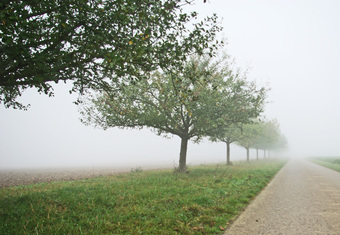 Das Foto gehört zur Serie "Obstbäume". Es zeigt Apfelbäume zwischen Straße und Acker an einem Nebeltag. Das Bild ist unter CC0 lizenziert und kann somit frei verwendet werden.