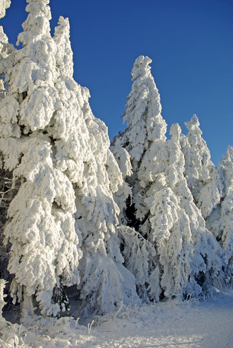 Das Bild gehört zur Serie "Winterlandschaft". Es zeigt verschneite Nadelbäume. Das Bild ist unter CC0 lizenziert und kann somit frei verwendet werden.