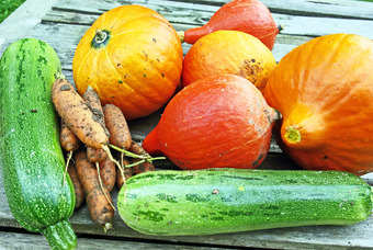Das Bild gehört zur Serie "Gemüse". Es zeigt Kürbisse und Karotten (Möhren) und Zucchini. Das Bild ist unter CC0 lizenziert und kann somit frei verwendet werden.