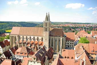 Das Foto zeigt einen Blick auf die evangelisch-lutherische Stadtpfarrkirche St. Jakob in Rothenburg ob der Tauber. Das Bild ist unter CC0 lizenziert und kann somit frei verwendet werden.