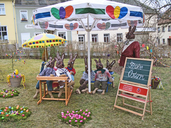 Das Foto gehört zur Serie "Ostern". Es zeigt die Hasenschule, eine Osterdekoration neben der Osterkrone in Berga/Elster. Das Bild ist unter CC0 lizenziert und kann somit frei verwendet werden.