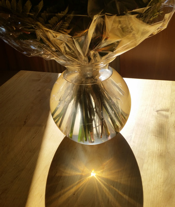 Das Bild gehört zur Serie "Optik". Es zeigt eine kugelförmige Blumenvase vor einem Fenster. Die Sonnenstrahlen werden beim Durchgang durch die mit Wasser gefüllte Vase gebrochen. Der Brennpunkt entsteht hier auf der Tischplatte. Das führte in diesem Fall zu einem angesengten Fleck (siehe zweites Bild unter "Verwandte Bilder"). Das Bild ist unter CC0 lizenziert und kann somit frei verwendet werden.