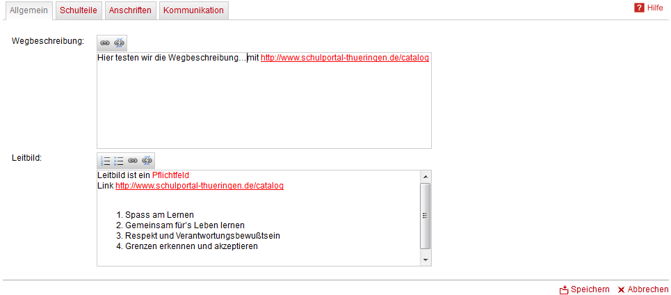 Es ist möglich, im Textfeld Leitbild einen aktiven Link einzufügen. Hierzu muss die komplette URL des Links mit