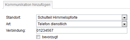 Die Zuordnung zum Schulteil, die Kommunikationsart und die Verbindung sind Pflichtfelder, wobei die der Schulteil und die Art aus einem Drop-Down-Menü gewählt werden können. Hier ist auch die Angabe einer URL zur eventuell bestehenden Schulhomepage möglich. Wählen Sie hierzu die Art "URL" aus und geben Sie unter Verbindung die vollständige Adresse an, also inklusive http://.