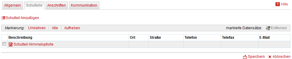 Anschließend können für diesen Schulteil Anschrift und Kommunikationsdaten erfasst werden. Alle erfassten Daten erhalten ein entsprechendes Schulteilkennzeichen in den jeweiligen Auflistungen. Für das Löschen eines Schulteils müssen zuerst alle zugehörigen Anschriften und Kommunikationsdaten gelöscht werden.