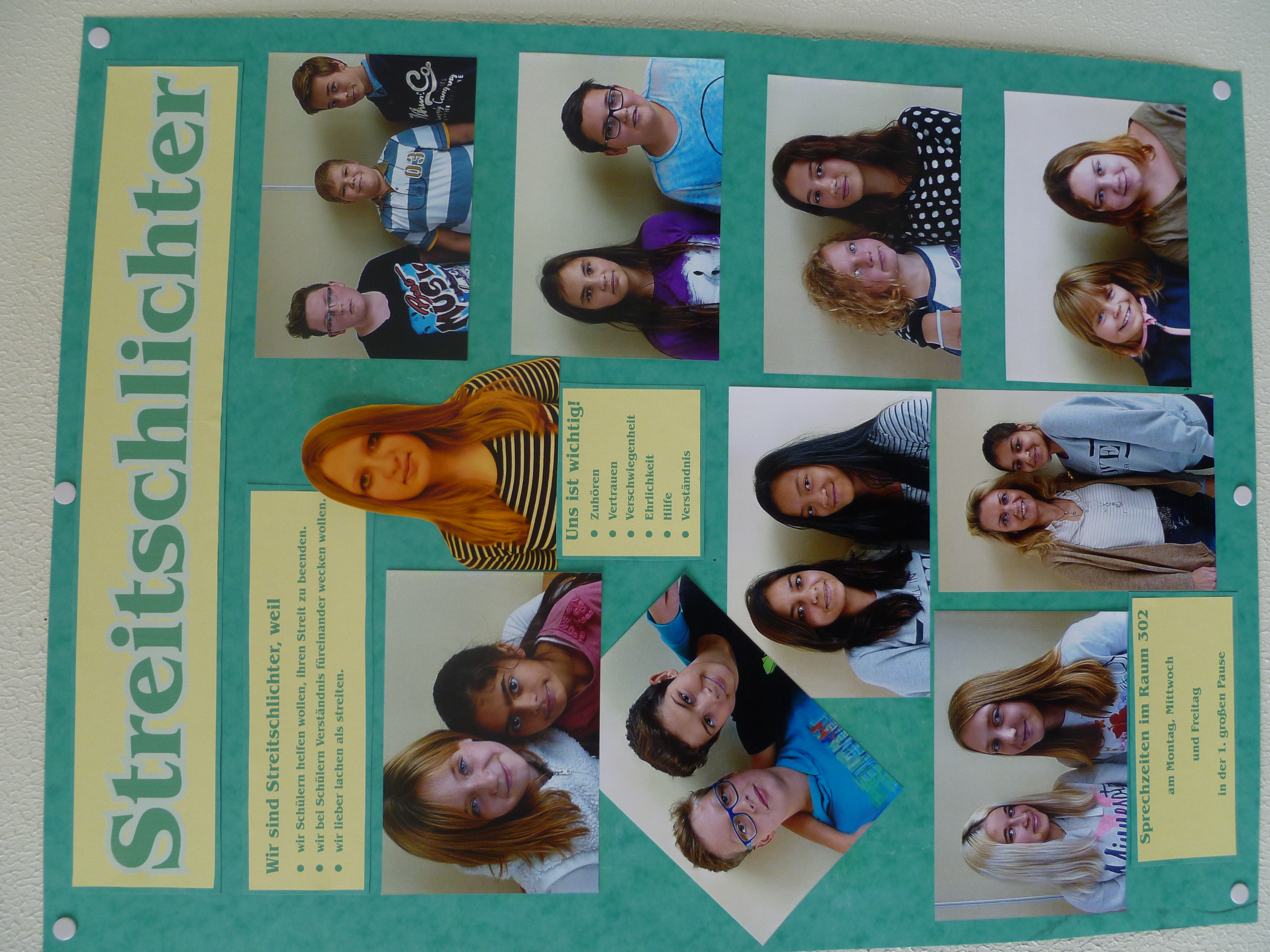 Das Team der Streitschlichter unter der Leitung von Frau Körmer arbeitet bereits seit einigen Jahren an unserer Schule. Die Mitarbeiter dieser Gruppe haben eine Mediatorenausbildung für Schüler absolviert und bieten regelmäßig Sprechstunden an.