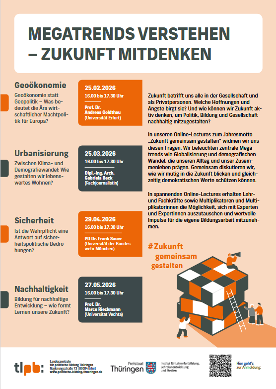 Die Reihe widmet sich langfristigen Veränderungsprozessen, die den gesellschaftlichen Alltag und das Zusammenleben nachhaltig prägen. In Online-Lectures beleuchten Expertinnen und Experten Megatrends wie Klimawandel oder Urbanisierung, ordnen diese fachlich ein und zeigen ihre gesellschaftliche Bedeutung sowie die damit verbundenen Chancen und Herausforderungen auf. Darüber hinaus werden Perspektiven für den gesellschaftlichen und bildungsbezogenen Umgang mit solchen Zukunftsthemen aufgezeigt.