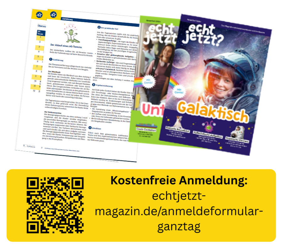 Mit „echt jetzt?“ im Ganztag steht pädagogischen Fach- und Lehrkräften ein niedrigschwelliges, sofort einsetzbares AG-Konzept mit zwölf Lerneinheiten zur Verfügung sowie ein Projekttageformat. Beide Angebote verbinden MINT-Themen (Mathematik, Informatik, Naturwissenschaft und Technik) mit Leseförderung und orientieren sich an den Ausgaben des Kindermagazins „echt jetzt?“ der Stiftung Kinder forschen und der Stiftung Lesen. Das Magazin erreicht im Unterricht bereits über 150.000 Kinder im Alter von 8 bis 10 Jahren und wird nun auch im Ganztag eingesetzt.